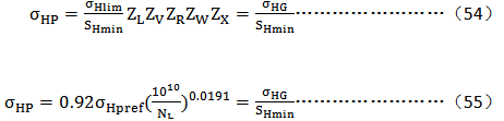 根據(jù)GB/T3480(或ISO6336-5),σHlim是在循環(huán)次數(shù)NL=5×107時得出的,高速齒輪的循環(huán)次數(shù)可能超過這個值.當(dāng)NL≤5×107時,可按式(54)計算σHP;當(dāng)NL>5×107時,在給出合適的條件(材料、制造)和有使用經(jīng)驗時,仍可按式(54)計算σHP,滯則,由式(55)計算σHP。