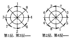2 焊前準備 (1)焊前轉軸表面應仔細清理,嚴格清除一切會產生氫氣的油類等雜質。 (2)選用J857 焊條,φ3. 2mm。焊前將焊條在爐中250~300℃烘干2h,隨用隨取,消除焊條中的水分�! �(3)在直流電焊機上采用反接法。3 焊補工藝 (1)將整個轉軸放進烘爐預熱到300℃后取出�! �(2)將轉軸吊到滾輪支架上,滾輪應支承于軸上φ135及φ140兩外圓處,裝上扳轉卡箍。 (3)采用對稱交錯焊補,每圈分8段,每層接頭收尾均應錯開, 填滿弧坑, 電流值取90A~100A,慢焊速,以防止轉軸過熱,減小熔深和熱影響區(qū)。采用連續(xù)施焊,焊縫寬度應大于6mm,高出轉軸表面2mm,第1層和第2層的焊接次序見圖2所示,第3層次序與第1層相同,第4層與第2層相同,其余類推。