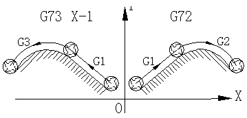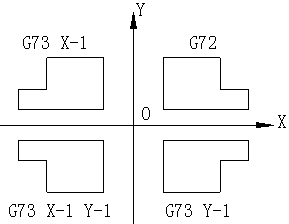 在數(shù)控加工程序代碼中,有個鏡像加工的指令。比如某型號加工中心的鏡像加工指令為G73(示意圖如圖1所示),其中設原加工圖形為第一象限的G72,使用G73 X-1指令后就可以加工出第二象限所示的圖形。也就是說將原程序段的加工代碼按Y軸或X軸(或XY混合)做軸向鏡像,當要加工鏡像體時不需要另外編制程序,只需要將原程序代碼加以鏡像即可。