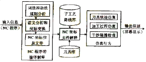 本文設(shè)計的數(shù)控車削仿真系統(tǒng)既可以對手工編制的單機數(shù)控車削程序進(jìn)行仿真,也可以作為CAD/CAPP/CAM集成制造系統(tǒng)中的一個子系統(tǒng),對集成制造系統(tǒng)自動產(chǎn)生的數(shù)控車削程序進(jìn)行仿真。該系統(tǒng)可以完成對子程序的處理,允許運動坐標(biāo)的續(xù)效代碼和注釋行的存在,并且支持多種數(shù)控代碼格式,是一個通用的數(shù)控車削NC 程序仿真系統(tǒng),其工作流程如圖1所示。