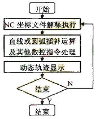 刀具軌跡動態(tài)仿真是根據(jù)要進(jìn)行仿真的數(shù)控代碼,在計算機屏幕上動態(tài)顯示刀具軌跡,以運動軌跡的方式來直觀顯示零件具體的加工過程;進(jìn)行刀具軌跡動態(tài)仿真時,順序讀入NC坐標(biāo)信息文件,獲取數(shù)控指令(直線、圓弧指令等)和命令參數(shù)(起點、終點和圓心坐標(biāo)等),然后執(zhí)行相應(yīng)的軌跡處理:對于直線和圓弧命令,則要根據(jù)其起止運動坐標(biāo),進(jìn)行直線和圓弧的插補運算,得到運動過程中離散的中間點的坐標(biāo)值,然后動態(tài)顯示刀具運動軌跡。刀具運動軌跡仿真算法流程如圖2所示。