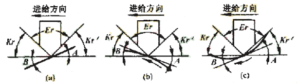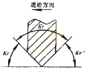 具體的干涉碰撞檢查算法,是在插值點將加工刀具的主偏角和副偏角與直線傾斜角度比較,對于圓弧段輪廓,則與該插值點在圓弧輪廓的切線的傾斜角進(jìn)行比較,并區(qū)分順圓和逆圓兩種情況。以右車刀切外輪廓為例,其對于直線和圓弧的干涉檢查如圖4所示。檢查結(jié)果將寫入一個干涉報告中,圖4中,kr為主偏角.kr'為副偏角,Er為刀尖角,A為與切削加工方向相反的傾斜角,B為與切削加工方向相同的傾斜角。當(dāng)A>kr時,刀具副切削刃和零件表面發(fā)生干涉,當(dāng)180°+B<180°-kr時,刀具的主切削刃和零件表面發(fā)生干涉,這時將發(fā)生過切現(xiàn)象二對于不同的加工方向和加工輪廓,上述判別式應(yīng)進(jìn)行相應(yīng)的調(diào)整。