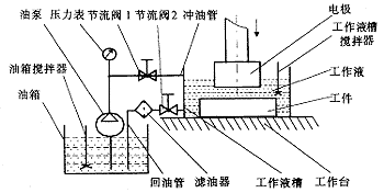 混粉鏡面電火花加工是近年來發(fā)展起來的一種改善大面積電火花加工表面粗糙度的先進(jìn)技術(shù),所謂混料鏡面電火花加工即是在工作液中添加了微粉,譬如,硅粉、鋁粉、鉻粉,以及有關(guān)添加劑,以期使加工表面獲得鏡面效果。日本最早進(jìn)行了研究,并取得了較好的效果。國內(nèi)起步較晚,哈爾濱工業(yè)大學(xué)特種加工所近來也進(jìn)行了這一領(lǐng)域的研究。由于在工作液中混入了微粉,因此不能用電火花機(jī)床原有的工作液循環(huán)裝置。我們在前期的試驗(yàn)中應(yīng)用簡易工作液循環(huán)裝置發(fā)現(xiàn)存在如下問題:(1)加工中混在工作液中的粉末有較嚴(yán)重的沉積的現(xiàn)象,影響了電極與工件的正常放電;(2)粉末在工作液中分布的均勻性也不理想,影響了放電的分散性,不利于提高工件的表面粗糙度;(3)沖油控制不便。因此需要重新設(shè)計(jì)工作液循環(huán)裝置。