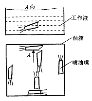 油箱攪拌器和工作液槽攪拌器是本工作液循環(huán)系統(tǒng)的關(guān)鍵,也是本實(shí)驗(yàn)裝置與普通電火花機(jī)床的顯著區(qū)別之處。油箱攪拌器在工作原理和結(jié)構(gòu)上可以有三種方式,如圖3、圖4、和圖5所示。圖3的結(jié)構(gòu)是利用電動機(jī)帶動葉片做旋轉(zhuǎn)運(yùn)動,來攪動工作液。其優(yōu)點(diǎn)是結(jié)構(gòu)簡單:缺點(diǎn)是由于離心力的作用,油箱中遠(yuǎn)離葉片中心處的微粉濃度要比靠近葉片中心處的高,造成微粉分布不均勻,另外,這種結(jié)構(gòu)一經(jīng)確定,不易調(diào)整攪拌器在油箱中的位置。圖4利用油泵將工作液從油箱A向A中抽出,通過安裝在油箱四周的噴油嘴注射回油箱中,形成湍流來達(dá)到攪拌工作液的目的。特點(diǎn)是微粉在工作液中分布比較均勻,而且結(jié)構(gòu)簡單,噴油嘴位置調(diào)整方便:缺點(diǎn)是由于增加了油泵,比前者成本高。圖5綜合了前兩種攪拌方式,用電動機(jī)帶動彎管旋轉(zhuǎn),再將工作液從彎管臂中噴出,因此攪拌后,工作液中微粉的分布要比前兩者均勻;但結(jié)構(gòu)復(fù)雜,成本也高得多。作者在本裝置的設(shè)計(jì)中采用圖4的結(jié)構(gòu),實(shí)踐證明攪拌效果達(dá)到預(yù)期目標(biāo)。工作液槽攪拌器的工作原理與油箱攪拌器大致相同,不再贅述。