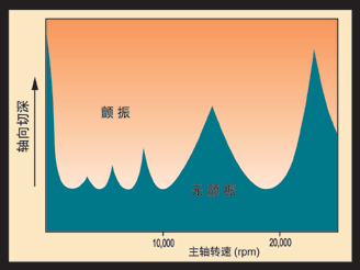 圖2 :該示意圖說明了由刀具、刀夾及高速主軸組成的特定系統(tǒng)中轉(zhuǎn)速和切深之間的關(guān)系。對于任何一個這樣的系統(tǒng),主軸轉(zhuǎn)速的上部分預(yù)計可以提供一個或多個""有效擊球點"",其中可以采用非常高的切深。