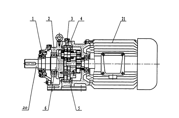 | 一種減速機(jī),電機(jī)(21)與針齒殼(4)聯(lián)接,針齒殼(4)與機(jī)座(2)聯(lián)接,其特征在于,空心行星架裝置(6)通過(guò)軸承設(shè)于機(jī)座(2)內(nèi),并與裝在針齒殼(4)內(nèi)的針齒銷(xiāo)(3)、擺線片(5)產(chǎn)生關(guān)聯(lián),太陽(yáng)輪(13)與電機(jī)(21)的電機(jī)軸(12)連接,輸出軸(20)和空心行星架(6)整合為一體延伸至機(jī)座(2)外。 |