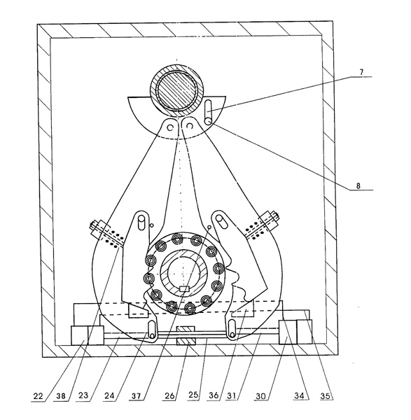 | 一種減速機,其特征是輸入軸是偏心軸(2),偏心軸(2)中間偏心外圓上設置3-12個外套(32),每個外套(32)上分別連接連桿(27)位于殼體(1)內(nèi)一側(cè),每個連桿(27)連接能與滾輪(13)邊緣上的滾子輪(10)嚙合的鉤齒板(16);在工作時至少有1個鉤齒板(16)和對應滾輪(13)邊緣上的滾子輪(10)嚙合,每個滾輪(13)邊緣上裝有5-80個滾子輪(10),上述所述的連桿(27)上裝有與滾輪(13)邊緣上的滾子輪(10)嚙合的鉤齒板(16)與對應的3-12個滾輪(13)分別固定在輸出軸(12)上,且兩個相鄰滾輪邊緣上的滾子輪(10)在橫向排列上相位差是一個等值弧度,在連桿(27)上設置有定位槽(24),固定銷(21)設置在連桿(27)定位槽(24)內(nèi)位于殼體(1)內(nèi),鉤齒板(16)背面設置有彈性復位裝置。 |