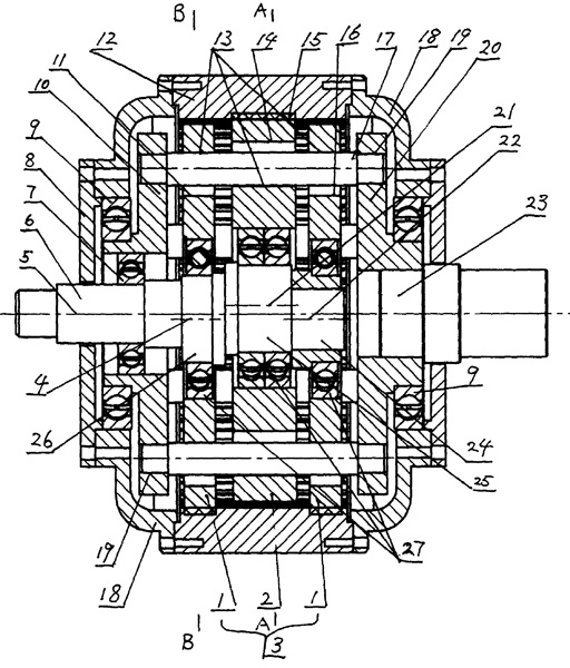 | 一種內(nèi)三環(huán)減速機,其特征在于:由環(huán)板、雙偏心輸入曲軸、輸出軸、軸承、支架、內(nèi)齒圈、銷子、端蓋、封頭等組成,其中:雙偏心輸入曲軸包括輸入軸、環(huán)板對稱軸,環(huán)板對稱軸與輸入軸同軸不同心,輸出軸與輸入軸為同一對稱軸;環(huán)板上帶有能穿過銷子的通孔,和能與軸固定的孔,環(huán)板由兩個環(huán)板(1)和一個環(huán)板(2)組成,兩個環(huán)板(1)與一個環(huán)板(2)重量相等且外徑相等,兩個環(huán)板(1)對稱分面于環(huán)板(2)兩邊,兩個環(huán)板(1)的對稱軸與環(huán)板(2)的對稱軸夾角為180,環(huán)板上帶有相同的外齒,內(nèi)齒圈上帶有內(nèi)齒,環(huán)板外齒與內(nèi)齒圈內(nèi)齒為少齒差傳動嚙合,支架上與環(huán)板對應處開有固定孔,銷子穿過環(huán)板上的通孔,其兩端分別固定在兩個支架的固定孔上,其中一個支架通過軸承固定在輸入軸上,另一個支架直接固定在輸出軸上,銷子與環(huán)板上的通孔相切,環(huán)板通過軸承固定在軸上,兩個支架通過軸承分別固定在輸入軸與輸出軸上,端蓋通過軸承固定在支架上,內(nèi)齒圈齒套在環(huán)板上,并與端蓋固接。 |