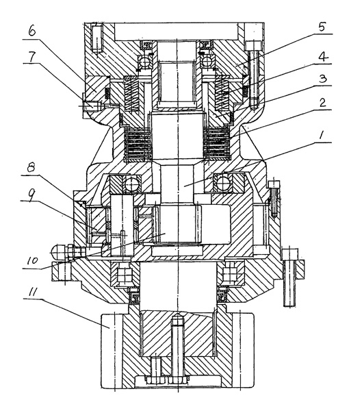 | 本實(shí)用新型提供的回轉(zhuǎn)減速機(jī),在殼體內(nèi)有常閉摩擦制動(dòng)機(jī)構(gòu)和行星減速機(jī)構(gòu),殼體包括馬達(dá)座[5]、油缸體、摩擦片座、行星輪架軸承座和內(nèi)齒殼體[8]等部分,其中油缸體、摩擦片座和行星輪架軸承座三部分為一件零件[6]。本實(shí)用新型提供的回轉(zhuǎn)減速機(jī),在滿足軸線加工要求的前提下將殼體上多個(gè)部分設(shè)計(jì)成一個(gè)零件,降低了安裝難度,減少了密封件的使用,提高了安裝牢固性、提高了防油料滲漏性能,另外還免去了被連成一體的零件中原先各部分端面的加工工序�?梢�(jiàn),本實(shí)用新型提供的回轉(zhuǎn)減速機(jī),節(jié)約了加工成本和裝配成本,提高了使用性能。 |