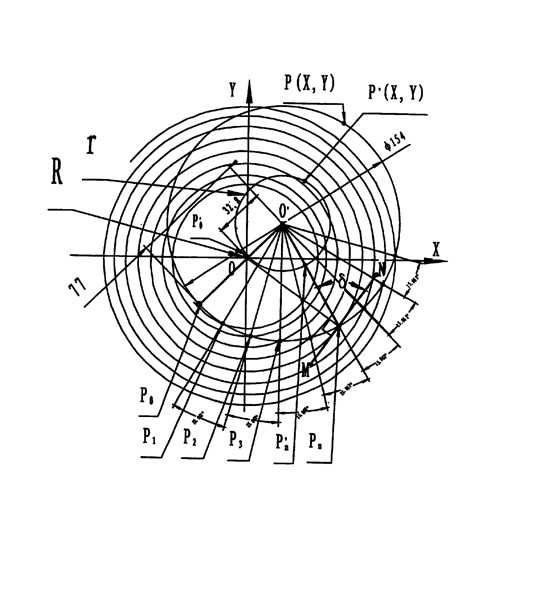 | 一種擺線蝸盤減速機,由機架、底板和機身所組成,其特征在于:它由擺線盤,滾盤和機架組成, 擺線盤由盤體,Ⅰ軸組成,Ⅰ軸緊固于盤體左側(cè)中心孔內(nèi),盤體為圓盤狀,它的前側(cè)面為錐形,錐面為“類單葉雙曲面”,面上有曲線槽,這曲線為“雙勻速擺線”公式為: �。 ∑渲校胰。遥�,r取±|r|;曲線槽的法向切面形狀及各部份幾何參數(shù)計算關(guān)系的標準化同于齒輪、齒條,或類似于梯形、鋸齒螺紋的幾何關(guān)系; 滾盤由盤身,Ⅱ軸以及K個滾輪、小軸、小套、鎖母組成;盤身為圓盤狀,它的中心右側(cè)固定著Ⅱ軸,盤周有K個斜孔,斜孔內(nèi)有螺紋配合著小套,小套左端由鎖母鎖定,小軸右端固定著滾輪,小軸的滾輪左側(cè)及小軸左端有軸承安裝于小套內(nèi);滾輪為單片錐形圓盤狀,它的H側(cè)面為凹錐面或平面,另一J側(cè)面為錐面;滾輪與擺線盤嚙合時它的H側(cè)凹錐面與曲線槽的凸側(cè)面相靠,J側(cè)錐面與曲線槽的凹側(cè)面相靠,這H、J兩側(cè)面交角d取曲線槽兩側(cè)齒形壓力角的和; 機架由機身,左蓋、右蓋、左壓盤、右壓盤組成;機身是下部有底板的圓筒,底板是四周有安裝孔的平板,左蓋、右蓋均為盤形,它們分別安裝于機身的左、右兩端面,左蓋中心固定有與其中心線有一偏斜角的斜套,斜套孔內(nèi)用軸承安裝著Ⅰ軸,左壓盤固定于斜套左端,它是緊壓Ⅰ軸左端軸承外圈的圓盤,它中心有孔,用密封圈套于Ⅰ軸左部;右蓋中心固定有大套,大套孔內(nèi)用軸承安裝著Ⅱ軸,右壓盤固定于大套右端,它是緊壓Ⅱ軸外端軸承外圈的圓盤,它中心有孔,用密封圈套于Ⅱ軸右部;Ⅰ、Ⅱ軸均伸出機架,兩軸中心距為R+r,滾盤一側(cè)的滾輪與擺線盤一側(cè)的曲線槽達正確嚙合而另一側(cè)為分離狀態(tài)。 |
