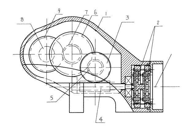 | 本實(shí)用新型提供的是一種緊湊型大減速比減速機(jī)。它包括殼體和安裝在殼體內(nèi)的減速機(jī)構(gòu),所述的減速機(jī)構(gòu)包括行星齒輪機(jī)構(gòu)、蝸輪蝸桿機(jī)構(gòu)和齒輪機(jī)構(gòu),行星齒輪機(jī)構(gòu)的輸出軸與蝸桿同軸,蝸輪與蝸桿相配合,蝸輪上安裝有同軸齒輪、且該齒輪與大齒輪相嚙合,與大齒輪同軸的齒輪與輸出軸上固定的齒輪嚙合。本實(shí)用新型通過(guò)行星齒輪機(jī)構(gòu)、蝸輪蝸桿機(jī)構(gòu)和齒輪機(jī)構(gòu)相互配合,達(dá)到減速目的,通過(guò)這種組合,達(dá)到較大的減速比,使減速機(jī)的整體體積小,結(jié)構(gòu)緊湊、簡(jiǎn)單,從而降低制作成本,且使減速機(jī)的安裝使用更方便。 |
