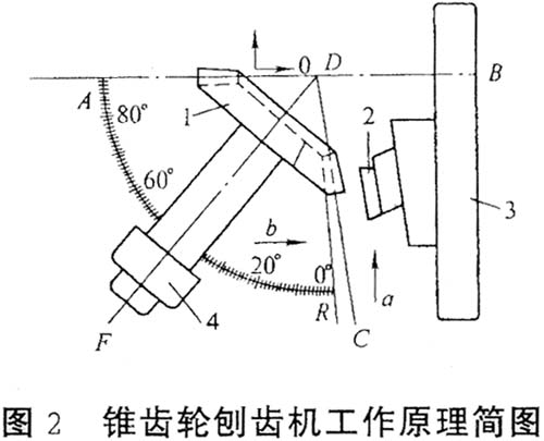 裝在機(jī)床搖臺(tái)3的滑枕上的刨齒刀2,除了可以按a向移動(dòng)以外,還可以繞搖臺(tái)軸線OB轉(zhuǎn)動(dòng)。齒坯一方面繞OF轉(zhuǎn)動(dòng),同時(shí)按箭頭b方向移動(dòng),使它的節(jié)錐中心O和機(jī)床中心D重合后即可進(jìn)行加工。