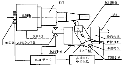 整個系統(tǒng)由數(shù)控刀架、Inter8031單片機、步進(jìn)電機驅(qū)動電源、用于拾取主軸信號的編碼器以及檢測縱向起始信號的位置檢測元件再加上機床本體組成。系統(tǒng)改裝是在原普通車床的基礎(chǔ)上進(jìn)行的,整個改裝工作量并不大,只需作以下工作: