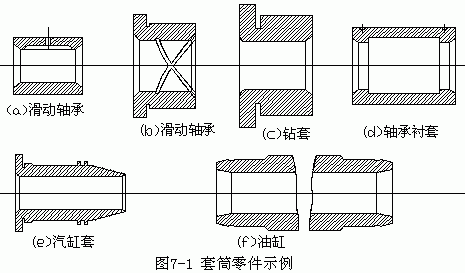 套筒類零件是機械中常見的一種零件,它的應用范圍很廣。如支承旋轉軸的各種形式的滑動軸承、夾具上引導刀具的導向套、內燃機氣缸套、液壓系統(tǒng)中的液壓缸以及一般用途的套筒,如圖 7 - 1 所示。由于其功用不同,套筒類零件的結構和尺寸有著很大的差別,但其結構上仍有共同點,即:零件的主要表面為同軸度要求較高的內外圓表面;零件壁的厚度較薄且易變形;零件長度一般大于直徑等。