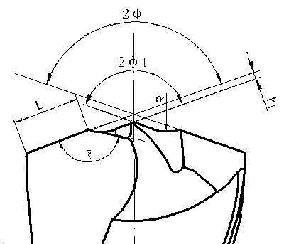 外刃鋒角2F過(guò)小時(shí)(2F<125°)難以磨出x=150~165°尖角。切屑易卷在容屑槽內(nèi),不宜排除。實(shí)踐經(jīng)驗(yàn)表明,2F=135°~140°,切屑流出方向逼近與鉆頭軸線平行,有利排屑。而且容易形成較大的x角,控制出現(xiàn)“6”字屑。