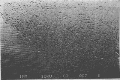 油膜相對于重載很薄的潤滑條件下運(yùn)轉(zhuǎn)的齒輪副工作齒面的損傷。損傷面放大后可見密密麻麻成片的微小蝕微小裂紋。