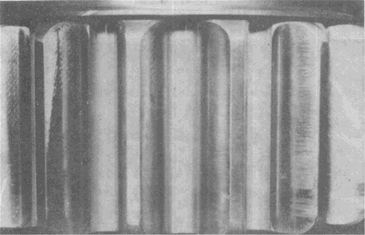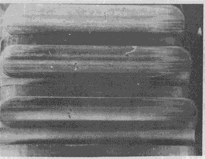 具有中等磨損的小齒輪齒面。齒面上工作節(jié)曲面的位置清晰可辨。