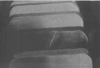 在齒輪切削過程中顯露出的由于鍛造缺陷引起的裂紋。