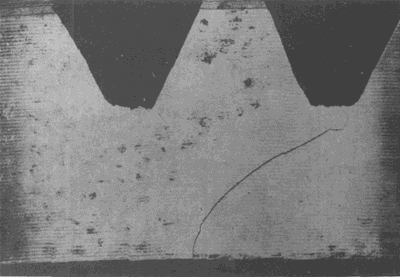 在大齒輪齒頂形成的淬火裂紋(這種裂紋通常都在這個區(qū)域出現(xiàn))。