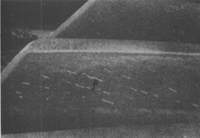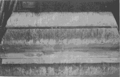 高速運(yùn)轉(zhuǎn)齒輪齒面頂部的沖蝕,其部位與潤滑劑噴嘴的方向一致。