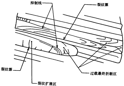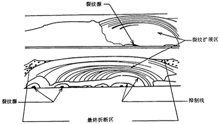 斷口面分為兩個不同的區(qū)域,疲勞斷口面和最終斷口面。在疲勞區(qū)內(nèi)看不到塑性變形痕跡,斷口面平滑、無光澤,有時由于被抑制線分割,可顯現(xiàn)出裂紋擴(kuò)展各連續(xù)階段的間隔區(qū)。