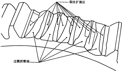 輪齒承載面下邊的齒根過渡曲面處出現(xiàn)的疲勞裂紋。