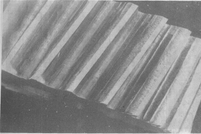 小齒輪輪齒右端載荷最大處的起皺。這種類型的起皺多發(fā)生于高度拋光的齒面。