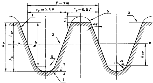 1- 標準基本齒條齒廓;2-基準線;3-齒頂線;4-齒根線;5-相嚙標準基本齒條齒廓