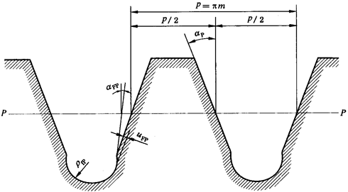 注:標準基本齒條齒廓的輪齒介于齒頂處的齒頂線和與之平行的齒底部的齒根線之間。齒廓直線部分和齒根線之間的圓角是半徑為ρfP的圓弧。