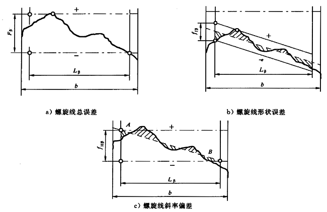 在被測(cè)圓柱面上,過(guò)評(píng)定范圍兩端交平均螺旋線A、B兩點(diǎn)的兩條理論螺旋線間的差值以fHβ表示(見(jiàn)圖6c)。