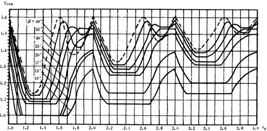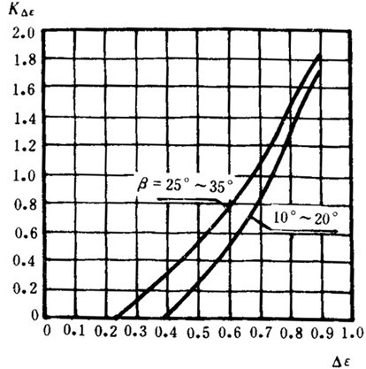 接觸跡系數(shù)是考慮重合度尾數(shù)Δε對輪齒應(yīng)力的影響系數(shù)。當(dāng)Δε較大時(shí),在相應(yīng)于Δε的齒寬部分,即使在最不利的情況下,也有部分接觸跡參與承擔(dān)載荷,使輪齒應(yīng)力有所下降。推薦Δε=(0.25~0.4)。KΔε值可按Δε由圖3查取。當(dāng)齒端修薄時(shí),應(yīng)根據(jù)減去齒端修薄長度后的有效齒長部分的Δε來查圖(當(dāng)20°<β°<25°時(shí),采用插值法查�。�。