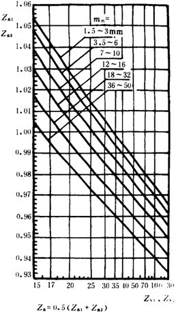 接觸弧長系數(shù)是考慮齒面接觸弧的有效工作長度對齒面接觸應(yīng)力影響的系數(shù)。當(dāng)齒數(shù)比不等于1時(shí),一個(gè)齒輪的上齒面和下齒面的接觸弧長不一樣。接觸弧長系數(shù)應(yīng)取兩個(gè)齒輪的平均值,即Za=0.5(Za1+Za2),Za1和Za2值可按小齒輪和大齒輪的當(dāng)最齒數(shù) 和 查圖6。