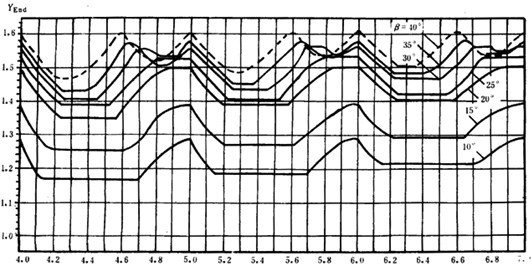 齒端系數(shù)是考慮接觸跡在齒輪端部時(shí),端面以外沒有齒根來參與承擔(dān)彎曲力矩,以致端部齒根應(yīng)力增大的影響系數(shù)。對于未修端的齒輪,YEnd值可根據(jù)εβ(εβ=b/Px)由圖8查�。ó�(dāng)β不是圖中值時(shí),用插值法查�。�