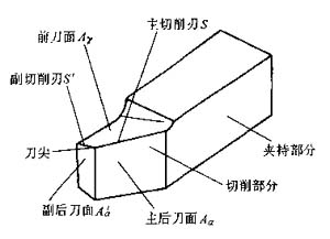 外圓車刀的切削部分可以看作是各類刀具切削部分的基本形態(tài)。圖2-1所示是外圓車刀的切削部分,其結構要素及其定義如下: