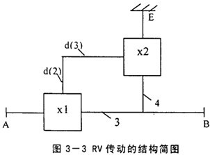 為計(jì)算RV傳動(dòng)的傳動(dòng)比,將上述的傳動(dòng)簡圖用圖3-3所示的結(jié)構(gòu)簡圖代替。該機(jī)構(gòu)簡圖包括兩個(gè)簡單行星機(jī)構(gòu):x1和x2。輸出件A為中心輪1,輸出件B為輸出盤6,且有ω6=ω4。支承件E為針輪7,漸開線行星輪2與轉(zhuǎn)臂(曲柄軸)3均為輔助件d。