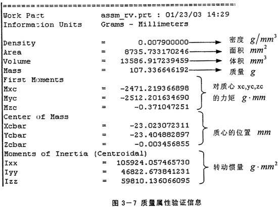 通過UG強(qiáng)大的質(zhì)量屬性檢驗(yàn)功能,可獲得每個(gè)零件及整個(gè)模型的密度、體積、質(zhì)量和慣量等必要信息。上圖3-7是所獲得的擺線輪的相關(guān)信息。