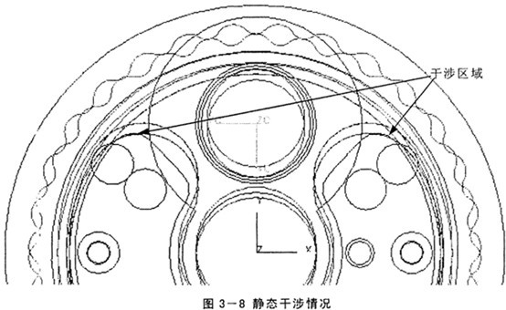 后三種都是實(shí)際結(jié)構(gòu)可能存在的,當(dāng)出現(xiàn)第一種干涉即硬干涉時(shí)就要引起高度重視,這可能是:設(shè)計(jì)存在問題,必須及時(shí)糾正。就是借助此功能,造型完成后,本人發(fā)現(xiàn)輸出盤與擺紅、輪間有硬干涉(見圖3-8),與設(shè)計(jì)此減速器的部門交換意見,原來他們在設(shè)計(jì)完后沒有發(fā)現(xiàn)此問題,等制造出成品后才發(fā)現(xiàn),便通過手工磨削將干涉部分除去。此處也充分體現(xiàn)了與傳統(tǒng)的設(shè)計(jì)方法相比,虛擬樣機(jī)技術(shù)有著不可比擬的優(yōu)越,即在制造第一臺(tái)物理樣機(jī)前就發(fā)現(xiàn)了機(jī)構(gòu)在結(jié)構(gòu)方面的缺陷。至于機(jī)構(gòu)的優(yōu)化和性能改進(jìn)方面,通過后面的仿真分析更能清楚地展現(xiàn)虛擬樣機(jī)技術(shù)的優(yōu)越。
