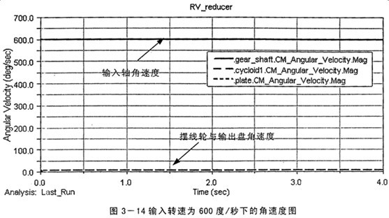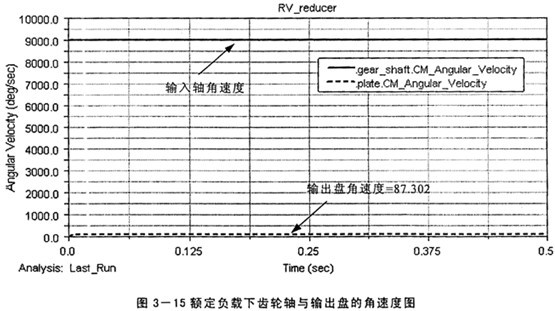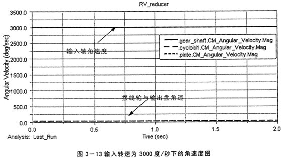 7=30,計(jì)算得到總的傳動(dòng)比為103,而由仿真得到的傳動(dòng)比在圖3-8中為i=3000/29.12=103.02,在圖3-9中為i=600/5.829=102.93,且圖中擺線輪與輸出盤的角速度相等說明輸出部分施加的約束滿足等角速度輸出原理。