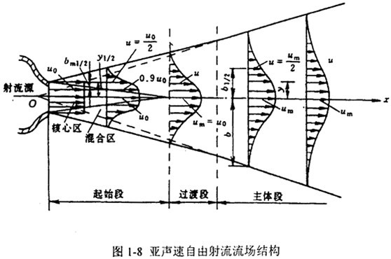 亞聲速自由射流在形成穩(wěn)定的流動形態(tài)后,整個射流可劃分為幾個區(qū)段:由噴口邊界起向內(nèi)外擴展的紊動摻混部分為紊動剪切層混合區(qū);中心部分未受摻混影響,保持原來出口流速,稱為核心區(qū),出口至核心區(qū)末端的一段稱為射流的起始段。紊動充分發(fā)展以后的部分稱為射流的主體段。主體段與起始段之間的區(qū)域稱為過渡段。