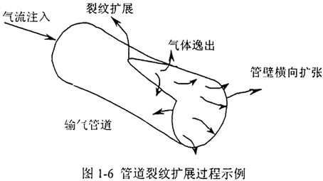 本文研究的重點將集中于如圖1-6的貯氣輸氣管線縱向裂紋擴展問題。針對這一問題,20世紀80年代末美國西南研究院(Southwest Research Institute,Texas)的M.F.Kanninen,O'Donoghue等人提出了輸氣管道縱向裂紋擴展問題的計算模型,將裂紋擴展的斷裂動力學算法同殼體有限元組合起來,發(fā)展了模擬計算程序PFRAC(Pipeline FRacture Analysis Code)。莊茁改進了其部分功能并擴展了組合受力分析的能力,發(fā)展了開裂結(jié)鉤與流體的解耦分析計算,并完成了解耦部分的計算程序。通過與實驗比較,該程序的可靠性得到了證實。