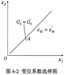 給定初值x1=1.0、x2=2.0,迭代過程及迭代結(jié)果如表4-2所示,給定限制條件下的變位系數(shù)選擇如圖4-4所示,交點(diǎn)A便對(duì)應(yīng)著這對(duì)齒輪的變位系數(shù)x11.14204,x2=1.40742。