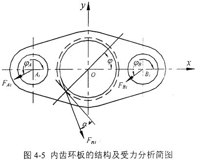也就是說:當(dāng)一個(gè)內(nèi)齒環(huán)板與外齒輪在某一位置嚙合時(shí),另一塊環(huán)板與外齒輪各自節(jié)圓之對(duì)滾弧長差為節(jié)圓齒距,相對(duì)相位差角為內(nèi)齒輪一個(gè)齒所對(duì)應(yīng)的圓心角,此時(shí)另一塊環(huán)板在該位置剛好能夠裝入。換句話說,對(duì)于本文的三環(huán)減速機(jī),按照4.3的制造工藝,就可以將三片內(nèi)齒環(huán)板均布地安裝在兩根高速偏心輸入軸上,并且保證它們之間的瞬時(shí)相位差呈180°角。