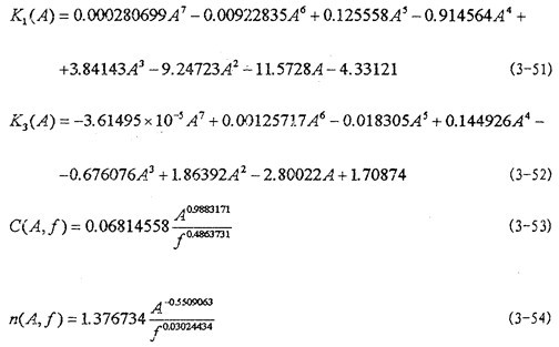 然后用線性參數(shù)辨識法和非線性參數(shù)辨識法,根據(jù)上面已經(jīng)得到的各個工況下K1(A),K3(A),K5(A),C(A,f)和n(A,f)的數(shù)值對(3-48)、(3-49)、(3-50)式中各參數(shù)進行辨識,將辨識得到各參數(shù)代入(3-48)、(3-49)和(3-50)式得: