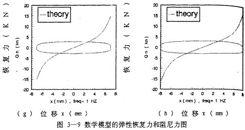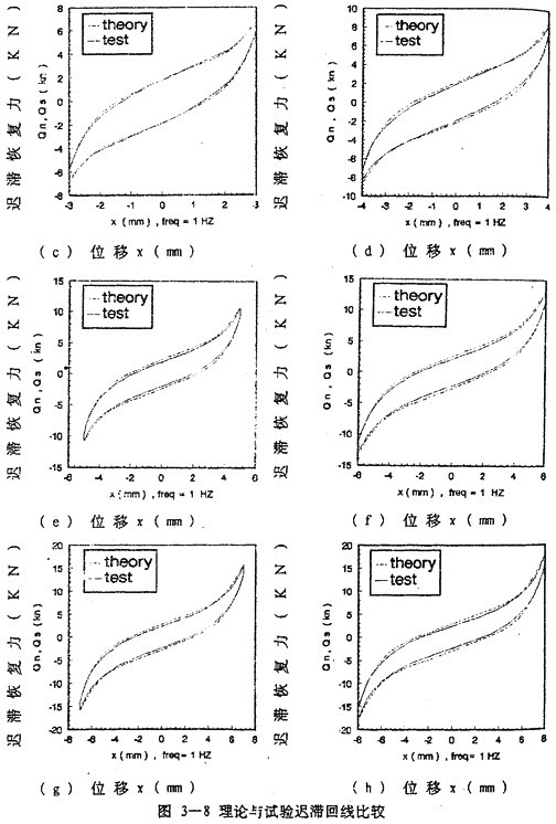 由數(shù)學(xué)模型(3-47) 計算可以得到不同激勵頻率和振幅下聯(lián)軸器恢復(fù)力遲滯回線數(shù)據(jù),為了證實(3-47)的正砷性,下面畫出頻率為1赫茲、振幅為1~8毫米各工況下數(shù)學(xué)模型計算的理論數(shù)據(jù)和試驗數(shù)據(jù)表示的遲滯回線圖,如圖(3-8)(a)~(h)(見51~52頁)所示,圖中虛線為理論回線,實線為試驗遲滯回線。從圖中可知,理論遲滯回線十分接近試驗遲滯回線,由此可以說明建立的聯(lián)軸器數(shù)學(xué)模型(3-47)式可較好地描述恢復(fù)力隨振幅A頻率f、瞬時位移x和速度分變化的規(guī)律,較圓滿地解決了聯(lián)軸器恢復(fù)力建模與參數(shù)函數(shù)辨識的難題。