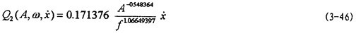 (A,f,x, )是振幅A、激勵頻率f、瞬態(tài)位移x和瞬態(tài)速度 的函數(shù),或者說恢復(fù)力Q是剛度函數(shù)K1(A),K3(A),K5(A)和阻尼函數(shù)C(A,f)以及阻尼成分函數(shù)n(A,f)的函數(shù),其中阻尼成分函數(shù)n(A,f)描述阻尼的組成情況,n(A,f)=0時,阻尼為干摩擦阻尼,n(A,f)=1時,為粘性阻尼,0<n(A,f)<1時,阻尼由粘性阻尼和干摩擦阻尼組成,n(A,f)>1時,阻尼成為“高階”阻尼。對于(3-47)式,當(dāng)振幅與頻率一定時,式中的Kl(A),K3(A),K5(A)和n(A,f)均為定數(shù),當(dāng)振幅A和頻率變化時,它們均是函數(shù),因此參數(shù)辨識實質(zhì)上是參數(shù)函數(shù)的辨識。首先我們用非線性參數(shù)辨識方法Marquardt法,根據(jù)試驗所得的數(shù)據(jù),按照(3-47)式對每一遲滯回線進行參數(shù)辨識,可以得到對應(yīng)的K1(A),K3(A),K5(A),C(A,f)和n(A,f)值,對每種工況下的數(shù)據(jù)隨振幅和頻率變化趨勢進行分析后,可以建立剛度函數(shù)、阻尼函數(shù)和阻尼成份函數(shù)的數(shù)學(xué)表達式為:
