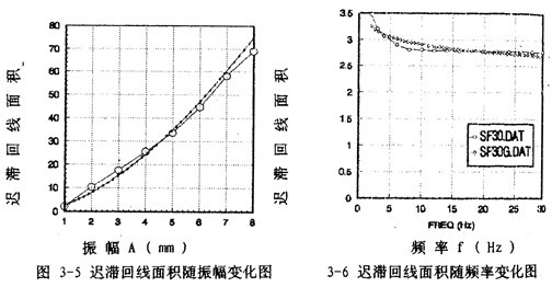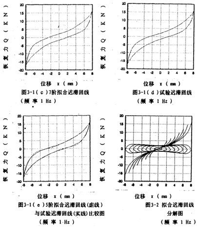 為了說明5階和7階冪函數(shù)多項式擬合的精度情況,以振幅A=8毫米,頻率為1赫茲為例,畫出擬合回線分別如圖3-1(b)、3-1(c)所示,將它們與對應(yīng)試驗回線圖3-1(d)比較,可知7階擬合精度高于5階。圖3-1(e)為圖3-1(b)與圖3-1(d)的合圖。