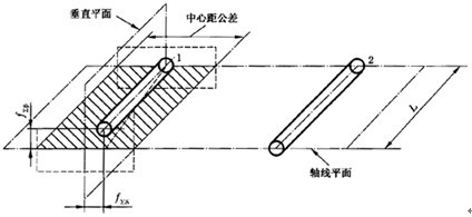 “軸線平面內(nèi)的偏差” f∑δ是在兩軸線公共平面上測(cè)量的,這公共平面是用兩軸承跨距中較長(zhǎng)的一個(gè)L和另一根軸上的一個(gè)軸承來(lái)確定的,如果兩個(gè)軸承的跨距相同,則用小齒輪軸和大齒輪軸的一個(gè)軸承�!按怪逼矫嫔系牡钠睢� f∑δ是在與軸線公共平面相相垂直的“交錯(cuò)軸平面”上測(cè)量的。