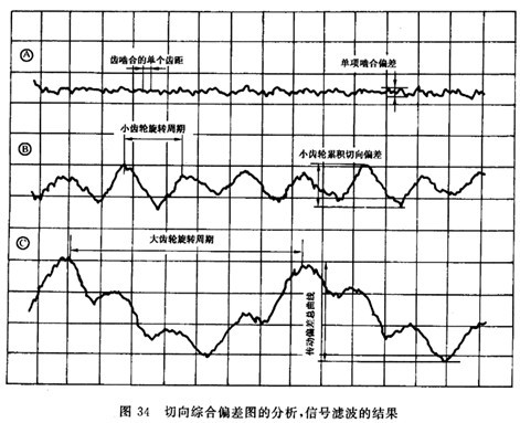 重要的事是記住,在濾掉長周期分量后,一齒切向綜合偏差fi′(圖33A)實際上變小了,這樣真正的最大偏差fi′就未必能在經(jīng)濾波后的短同期分量的曲線(圖33C)中表示出來。