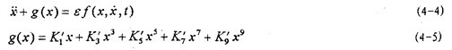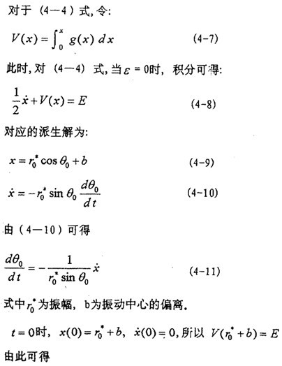目前文獻(xiàn)上的一些方法對(duì)于弱非線(xiàn)性系統(tǒng)是有效的,而對(duì)于(4-2)式的強(qiáng)非線(xiàn)性系統(tǒng)則遇到了麻煩。由于描述非線(xiàn)性振動(dòng)系統(tǒng)的微分方程種類(lèi)繁多,沒(méi)有普遍的解法,因此,仍然只有極少非線(xiàn)性振動(dòng)方程可求得精確解�?尚械霓k法是針對(duì)不同非線(xiàn)性振動(dòng)方程的特點(diǎn)尋求一些近似數(shù)值解法。為研究方便,將(4-2)式進(jìn)一步寫(xiě)成以下形式: