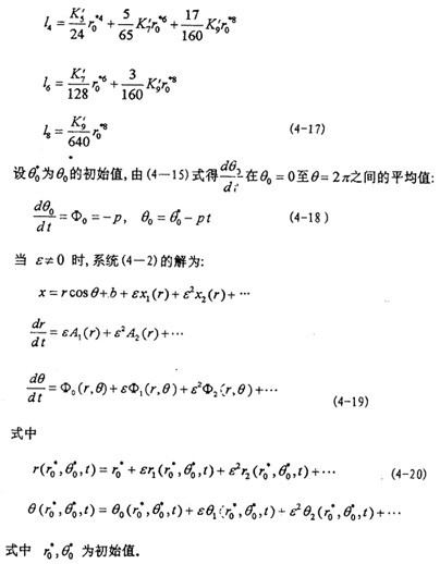 在非線(xiàn)性振動(dòng)系統(tǒng)中,當(dāng)系統(tǒng)受到周期性外力作用的情況下,有可能產(chǎn)生三類(lèi)運(yùn)動(dòng),非共振運(yùn)動(dòng),共振運(yùn)動(dòng),由非共振運(yùn)動(dòng)到共振運(yùn)動(dòng)的過(guò)渡過(guò)程,即瞬態(tài)運(yùn)動(dòng)。對(duì)于共振運(yùn)動(dòng)來(lái)說(shuō),有三類(lèi),(l)m=n,即ω=p,這是通常所說(shuō)的共振,稱(chēng)為主共振,(2)n=1,ω=mp,產(chǎn)生泛音共振,當(dāng)m為奇數(shù)時(shí),產(chǎn)生次諧波共振,(3)m=1,ω=p/n,當(dāng)n為奇數(shù)時(shí),產(chǎn)生超諧波共振。將幕級(jí)數(shù)形式的dθ0/dt代人(4-40),并計(jì)算該式在O-2區(qū)間的定積分,可以得出結(jié)論:只有當(dāng)n=1,m=±1,±3,±5,±7,……時(shí)才可能得到(4-2)的周期解,并且(4-2)式只可能產(chǎn)生主共振解和次諧波共振解。
